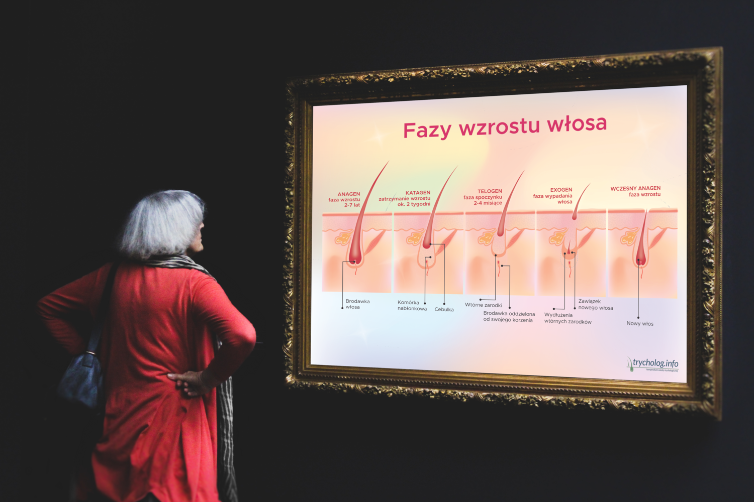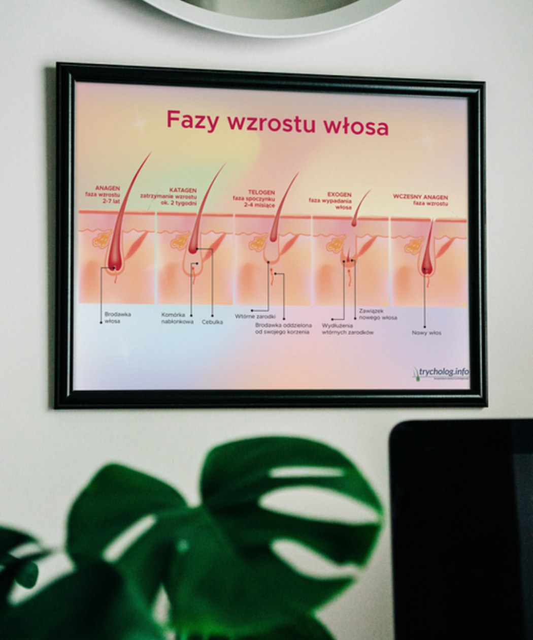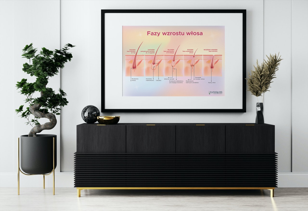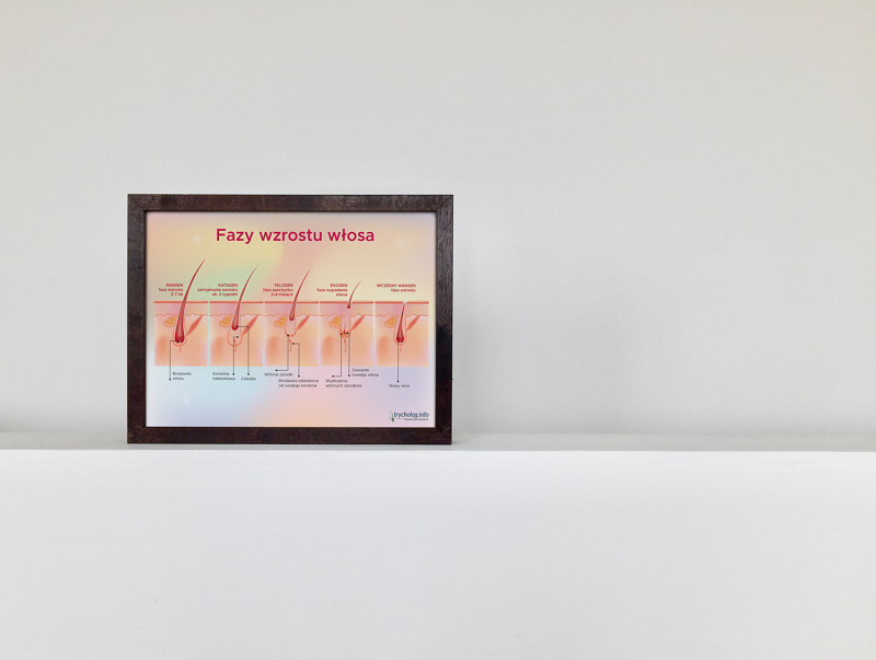 Plakat trychologiczny, który obrazowo pokazuje jak przebiega proces wzrostu w kilku fazach: