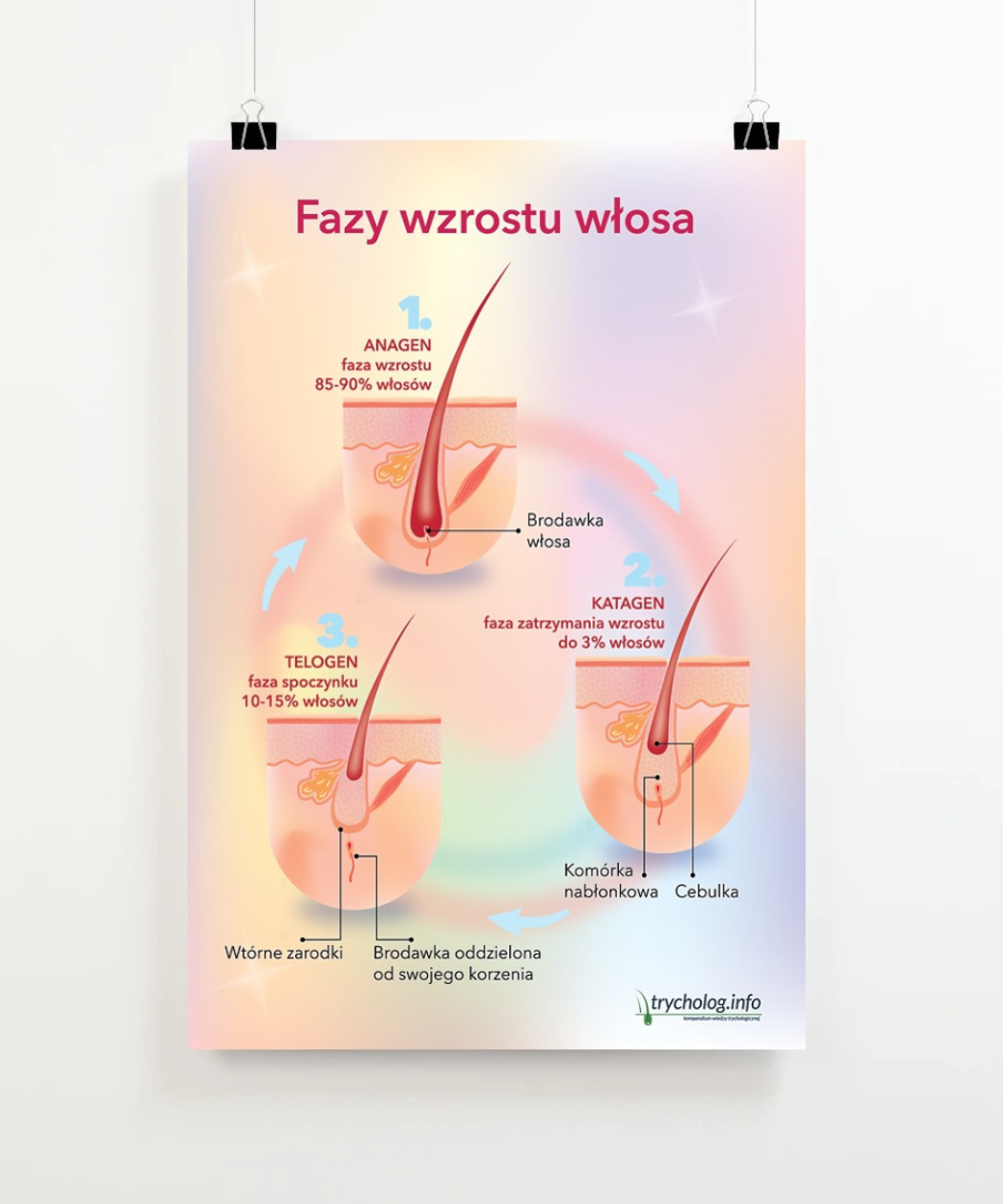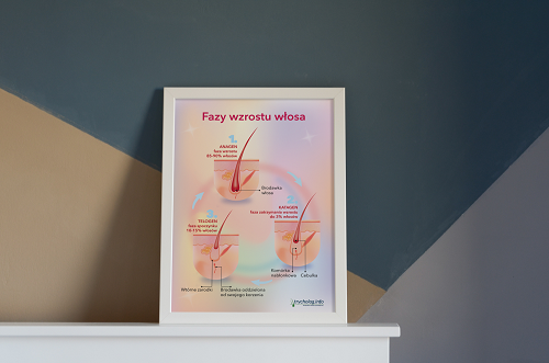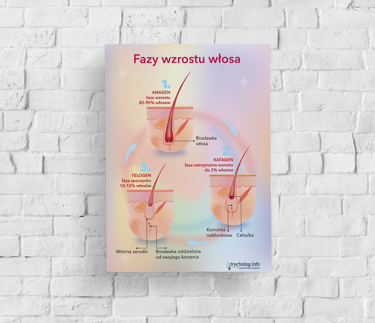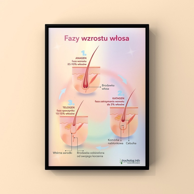 Plakat trychologiczny, który obrazowo pokazuje jak przebiega proces wzrostu włosa w trzech głównych fazach: anagenie, katagenie i telogenie.