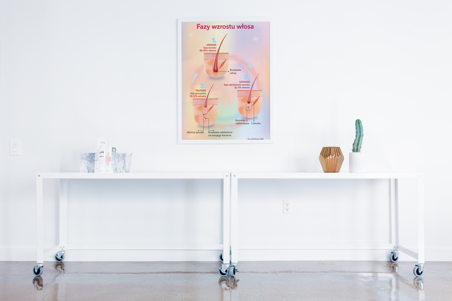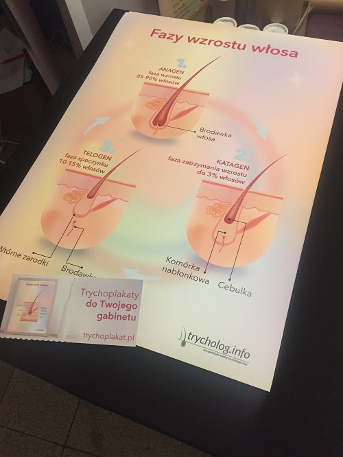 Może być wykorzystany zarówno w gabinecie trychologicznym, jak i kosmetologicznym czy fryzjerskim. Plakat pełni rolę informacyjną i edukacyjną.